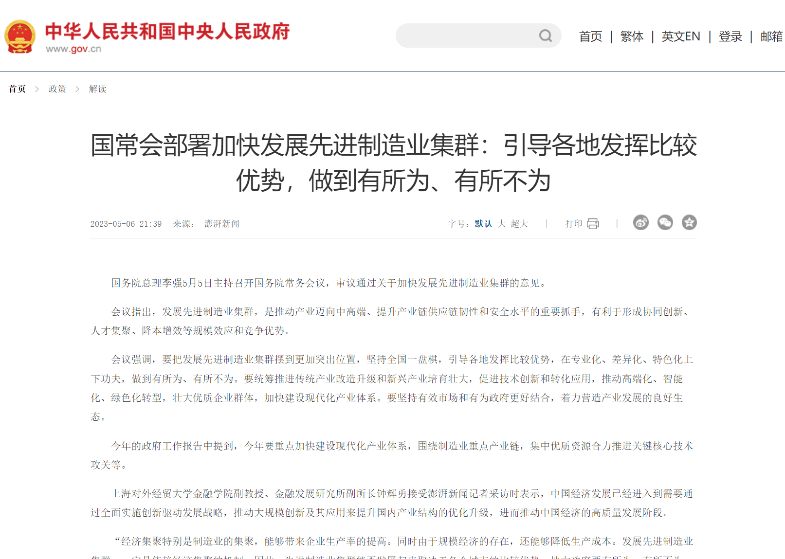 行业观点:钟世虎|中国政府网:国常会部署加快发展先进制造业集群:引导各地发挥比较优势,做到有所为、有所不为【2023年5月6日】