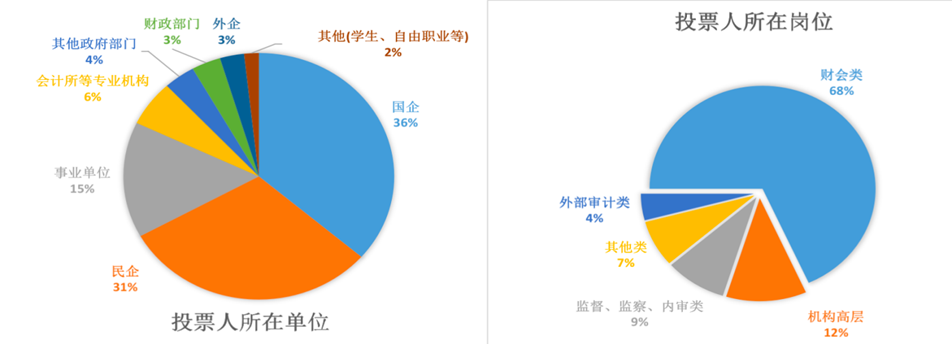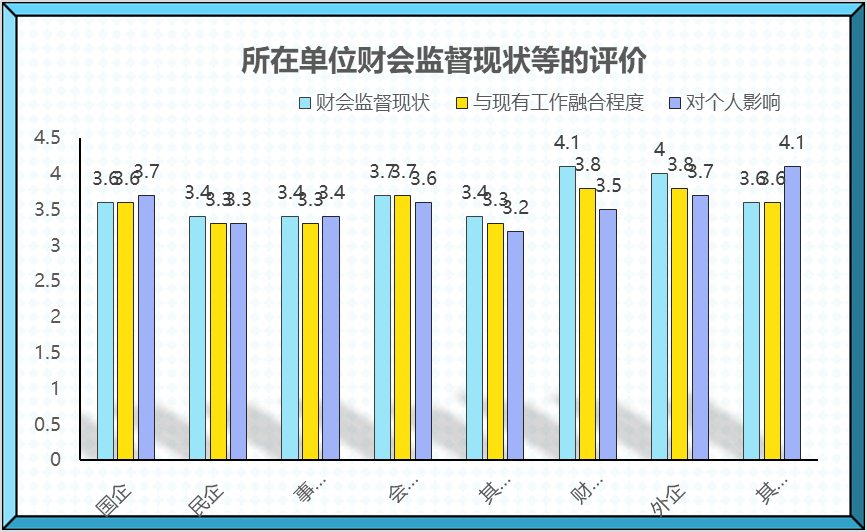 2. 按照投票人所在单位类型来划分。企业类的投票人中,外企的投票人是对所在企业财会监督工作现状评价最高(4分)、认为财会监督与现有工作融合度最好(3.8分),财会监督对个人影响最大(3.7分)的。财政部门的投票人对比其他政府部门的人,在三个问题的评价上都明显更高,需要关注如何调动其他政府部门参与和支持财会监督工作。