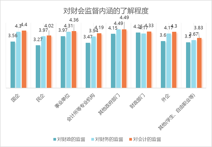 2. 在会计的监督方面,了解程度最高的是其他政府部门的投票人(4.49),其次为国企(4.40)、 事业单位(4.36)、财政部门(4.33)、外企(4.30)的投票人,他们的了解程度高于平均分,且相邻的差异不大。