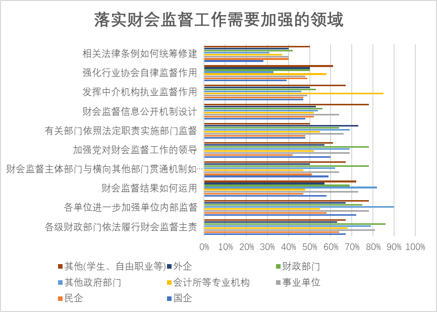 1. 就需要加强的领域,各级财政部门依法履行财会监督主责和各单位进一步加强单位内部监督这两项选择的人最多,分别有69%和68%的人选择。这意味着投票人对于财政部门、对于单位内部两个层面的财会监督履责较有期待。发挥中介机构执业监督作用(85%)和强化行业协会自律监督作用只是会计所等专业机构的人选择多一些(58%),这可以说明是相关者更关注,也说明这两项工作可强化的地方不多。