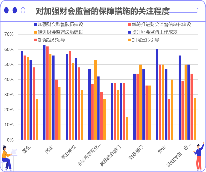 2. 从不同单位的投票人来看,企业的人都最关注加强财会监督队伍建设,分别是国企59%、民企63%、外企60%。财政部门、会计所等专业机构的人最关注的保障措施是法制建设,分别是50%和53%的人。数据显示在财会监督工作薄弱的民企,落实财会监督大有可为。
