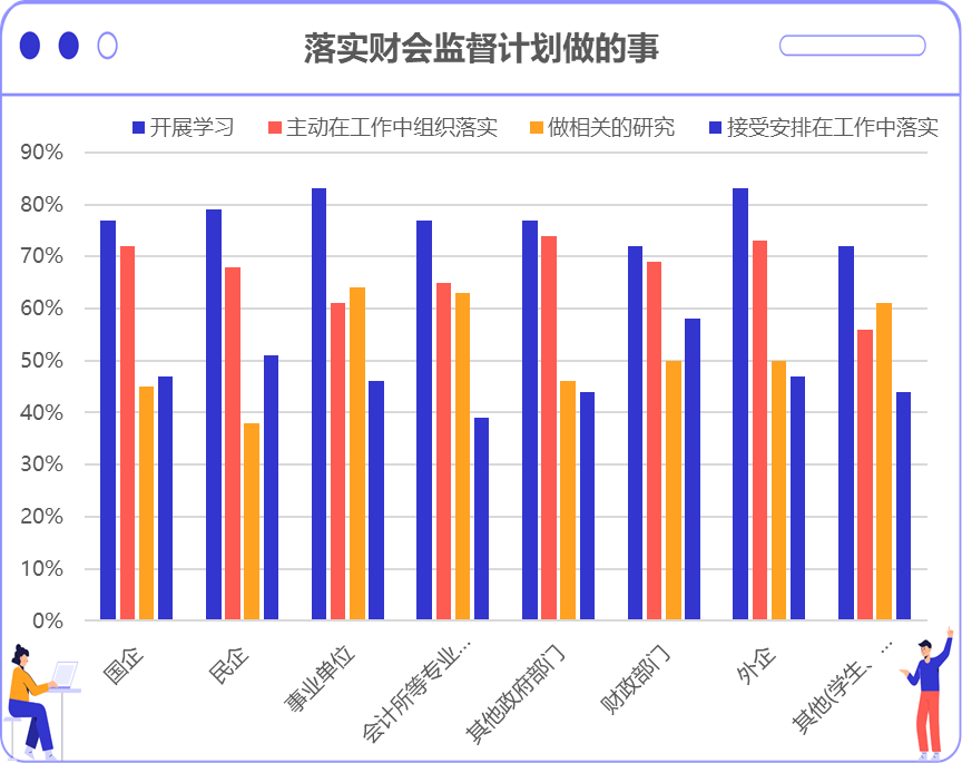1. 计划要做的事情,主要是两类:开展学习(79%的人选择),主动在工作中组织落实(68%的人选择)。然后是做相关的研究,接受安排在工作中落实,都是48%的人选择。6%民企的人选择“目前没有什么要做的”,这比例超过了其他人群,再次说明民企可能是财会监督工作的薄弱区域。