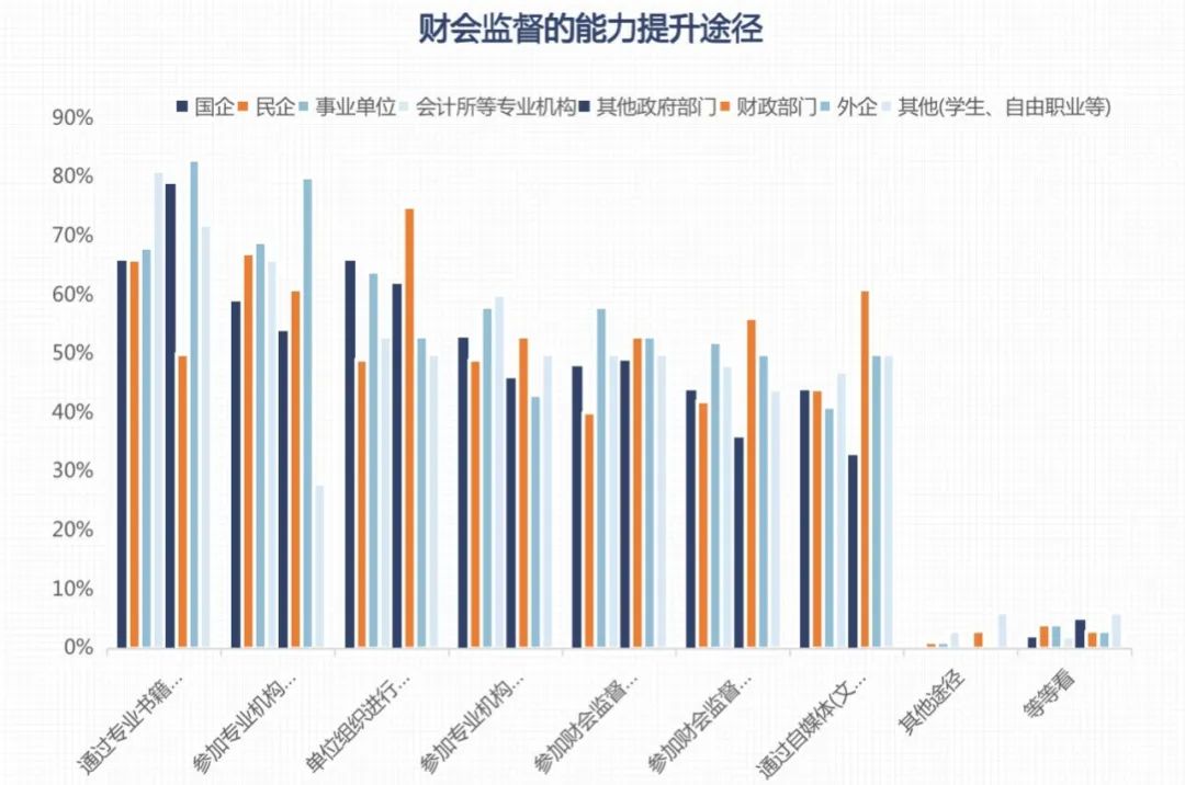 2. 从总体看,事业单位、财政部门和外企投票人的财会监督能力提升可选的途径较多,总体都在4.1个、4.2个。国企、民企和其他政府部门的人,则只有3.6或3.8个选择,选择相对要少一些。