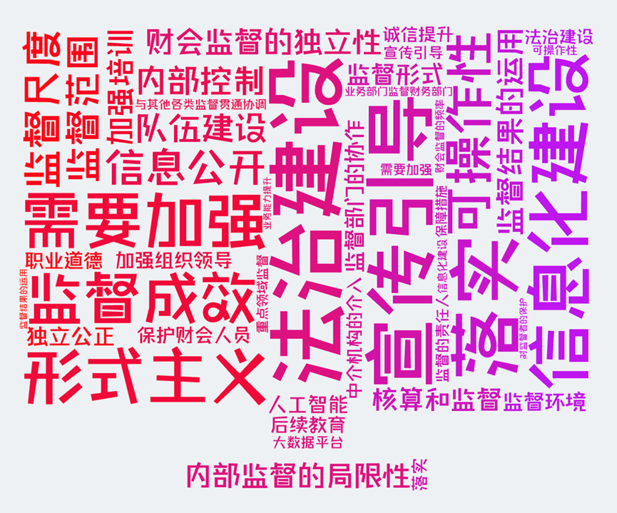 2. 不同单位类型的人,困惑点不一样。77%国企投票人关注财会监督对国企内部治理的影响;84%民企投票人最关注企业财务工作者监督职能与会计服务职能的冲突问题;78%事业单位投票人、74%其他政府部门投票人、64%财政部门投票人关注财会监督信息系统建设问题,也就是最关注具体怎么干的问题;85%会计所等专业机构投票人关注会计所的责任与风险控制,这是切身利益相关的。因此对财会监督要更多地调研了解,对症下药。