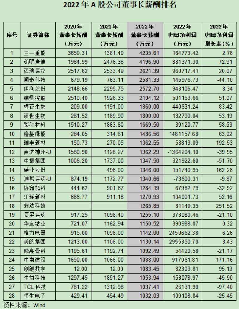 Wind数据显示,2022年,共有28家A股上市公司董事长薪酬超过1000万元,其中三一重能、药明康德董事长薪酬分别高达4235万元和4196万元。