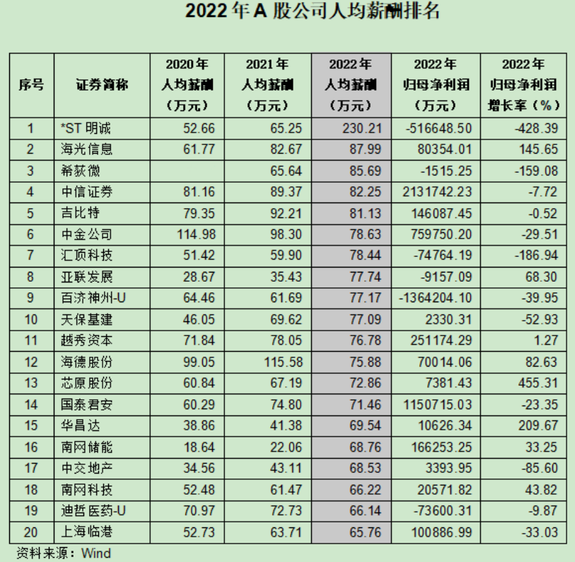 除*ST明诚外,人均年薪超过80万元的有海光信息(87.99万元)、希荻微(85.69万元)、中信证券(82.25万元)、吉比特(81.13万元)。其中希荻微2022年归母净利润为-1515.25万元,较上年下降159.08%,但其人均薪酬则较上年增加30.55%。