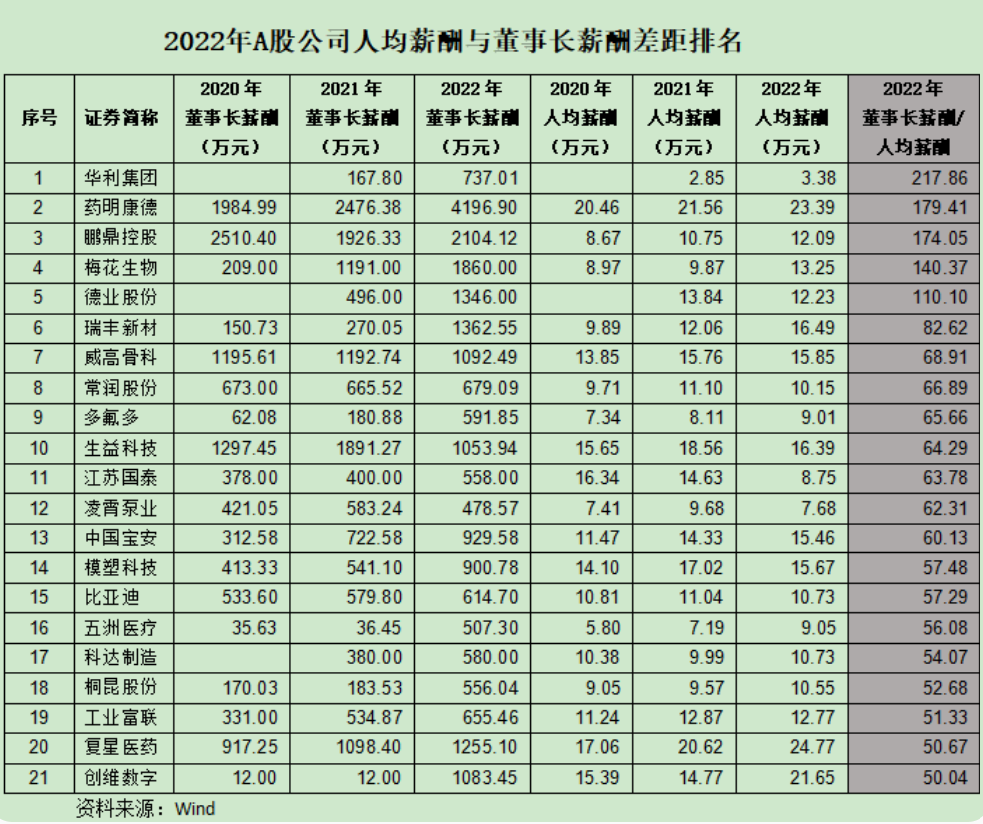 另据Wind数据显示,A股公司董事长薪酬超过公司人均薪酬50倍以上的共有21家,其中超过100倍的共有5家。