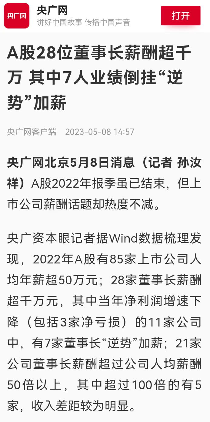 行业观点:叶小杰 钟世虎|央广网:A股28位董事长薪酬超千万 其中7人业绩倒挂“逆势”加薪【2023年5月8日】