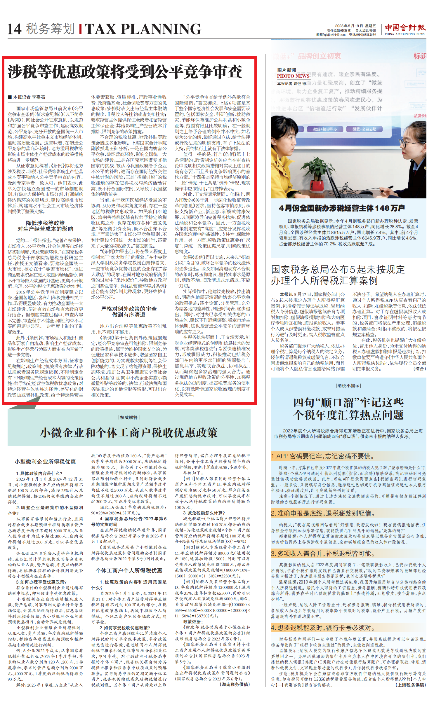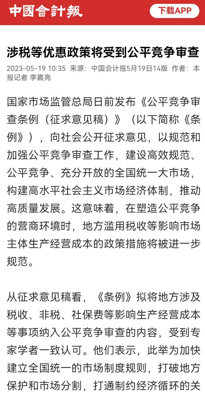 行业观点:葛玉御|中国会计报:涉税等优惠政策将受到公平竞争审查【2023年5月19日】