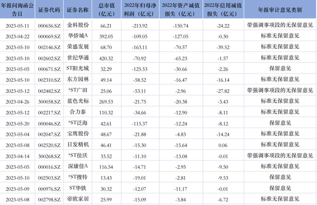 收函的上市公司市值均不超过500亿元,且9成公司市值不足100亿元。这270余家公司2022年归母净利润合计亏损约1580亿元,当期计提资产减值损失和信用减值损失合计约1160亿元。