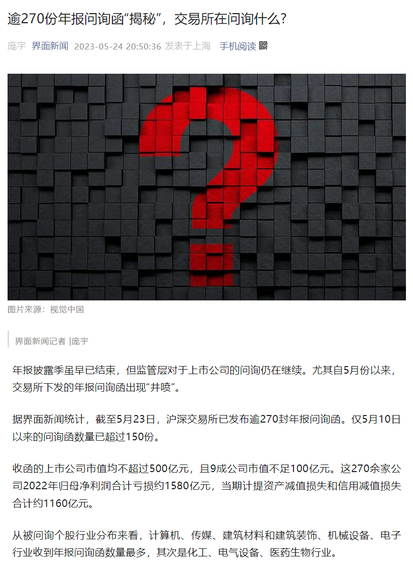 行业观点:叶小杰|界面新闻:逾270份年报问询函“揭秘”,交易所在问询什么?【2023年5月24日】