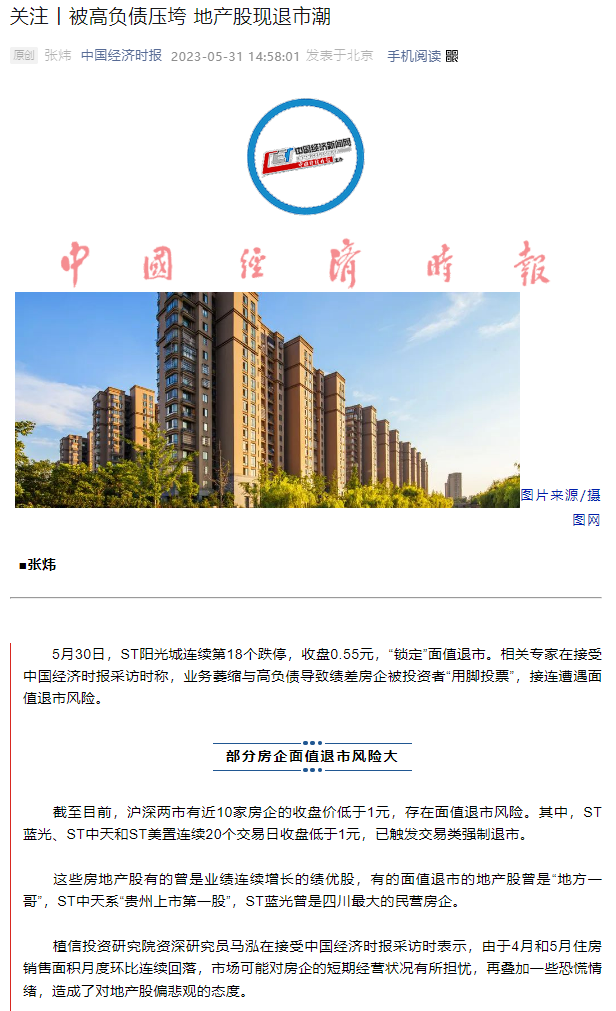 行业观点:吉瑞|中国经济时报:关注丨被高负债压垮 地产股现退市潮【2023年5月31日】