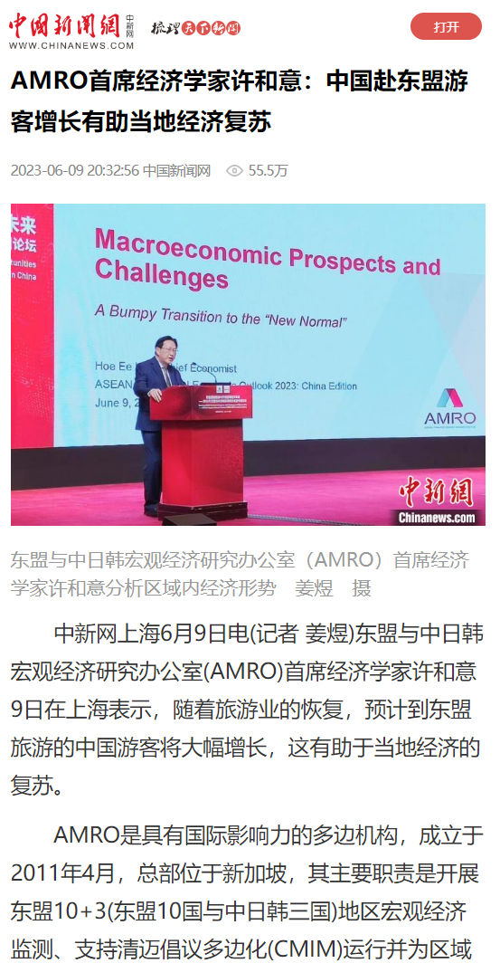 中新社:AMRO首席经济学家许和意:中国赴东盟游客增长有助当地经济复苏【2023年6月9日】