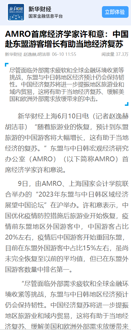 新华社:AMRO首席经济学家许和意:中国赴东盟游客增长有助当地经济复苏【2023年6月10日】