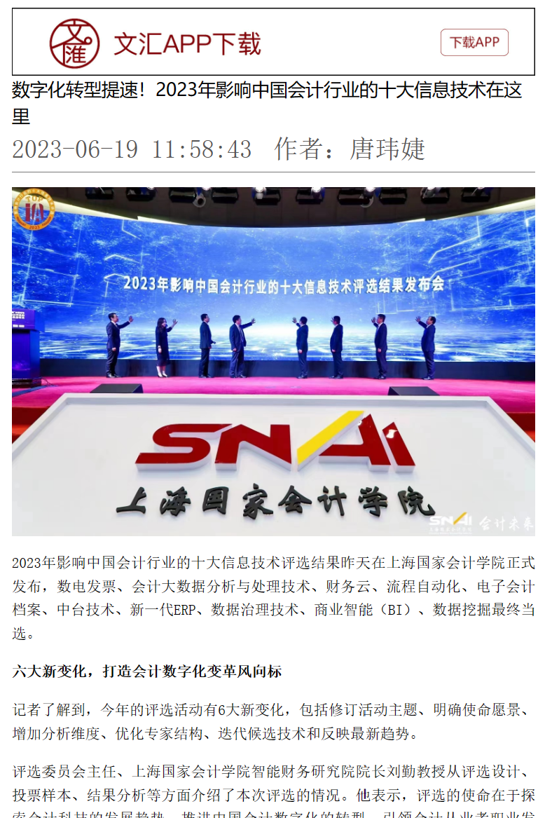 《文汇报》:数字化转型提速!2023年影响中国会计行业的十大信息技术在这里【2023年6月19日】