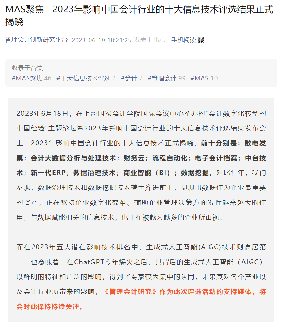 管理会计研究:MAS聚焦 | 2023年影响中国会计行业的十大信息技术评选结果正式揭晓【2023年6月19日】