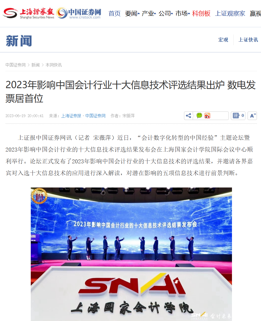 《上海证券报》:2023年影响中国会计行业十大信息技术评选结果出炉 数电发票居首位【2023年6月19日】