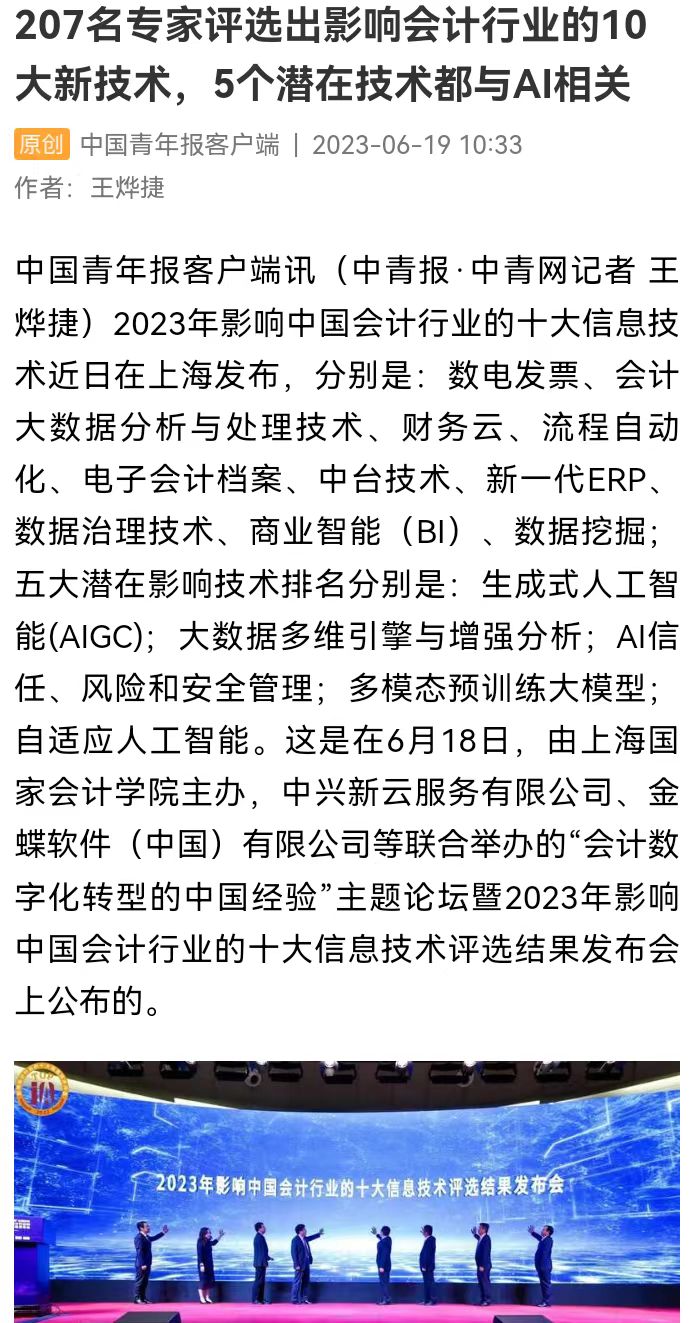 《中国青年报》:207名专家评选出影响会计行业的10大新技术,5个潜在技术都与AI相关【2023年6月19日】