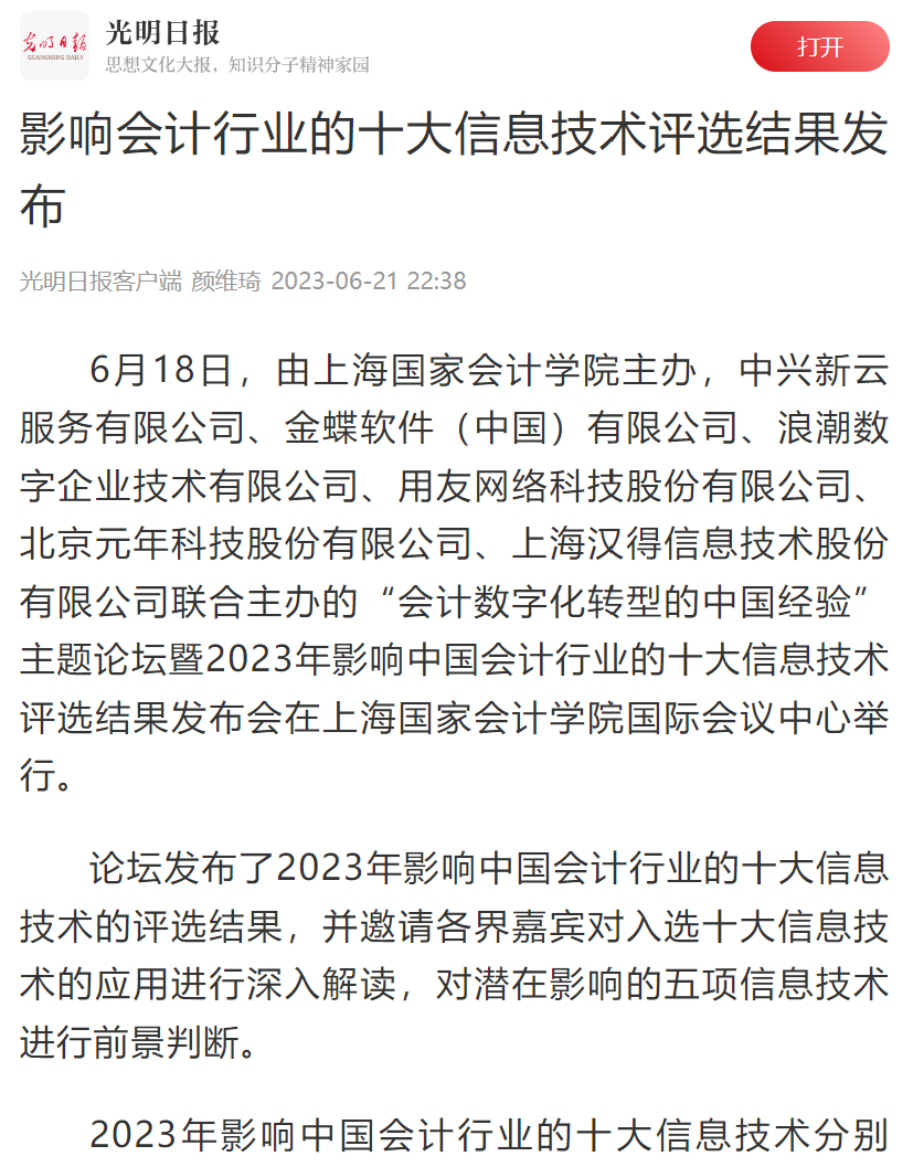 《光明日报》:影响会计行业的十大信息技术评选结果发布【2023年6月21日】