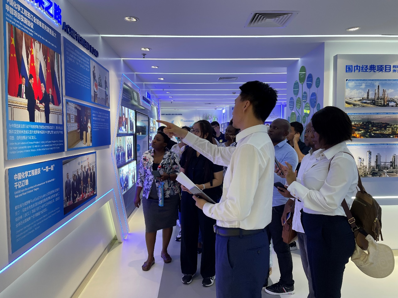 首先,留学生们来到集团展厅参观。中化学国际工程有限公司商务经理陈强向留学生们介绍了中国化学的发展历程和主要业务情况,并展示了中国化学在全球多个国家和地区的海外石油和化工工程模型及影像,给同学们留下了极为深刻的印象。