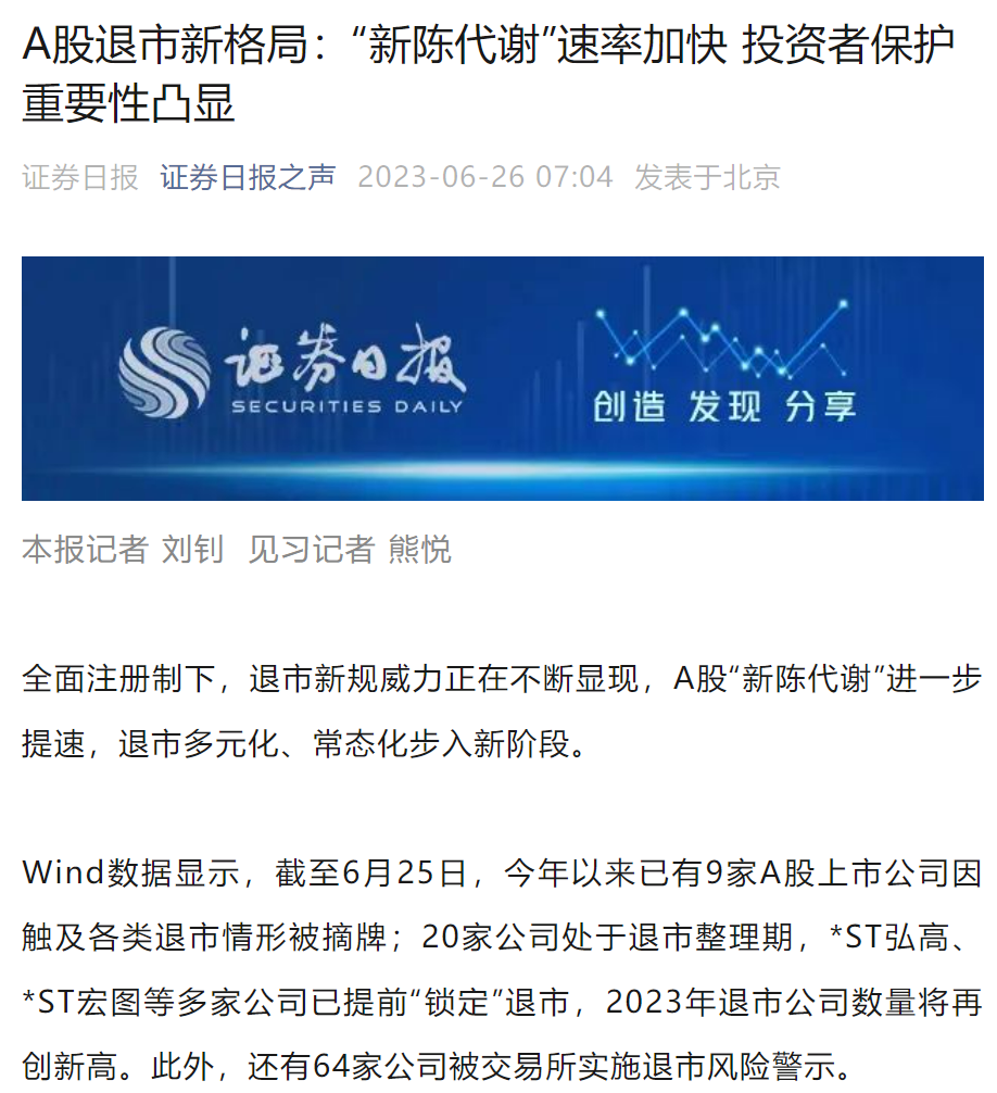 行业观点:叶小杰|证券日报:A股退市新格局:“新陈代谢”速率加快 投资者保护重要性凸显【2023年6月26日】