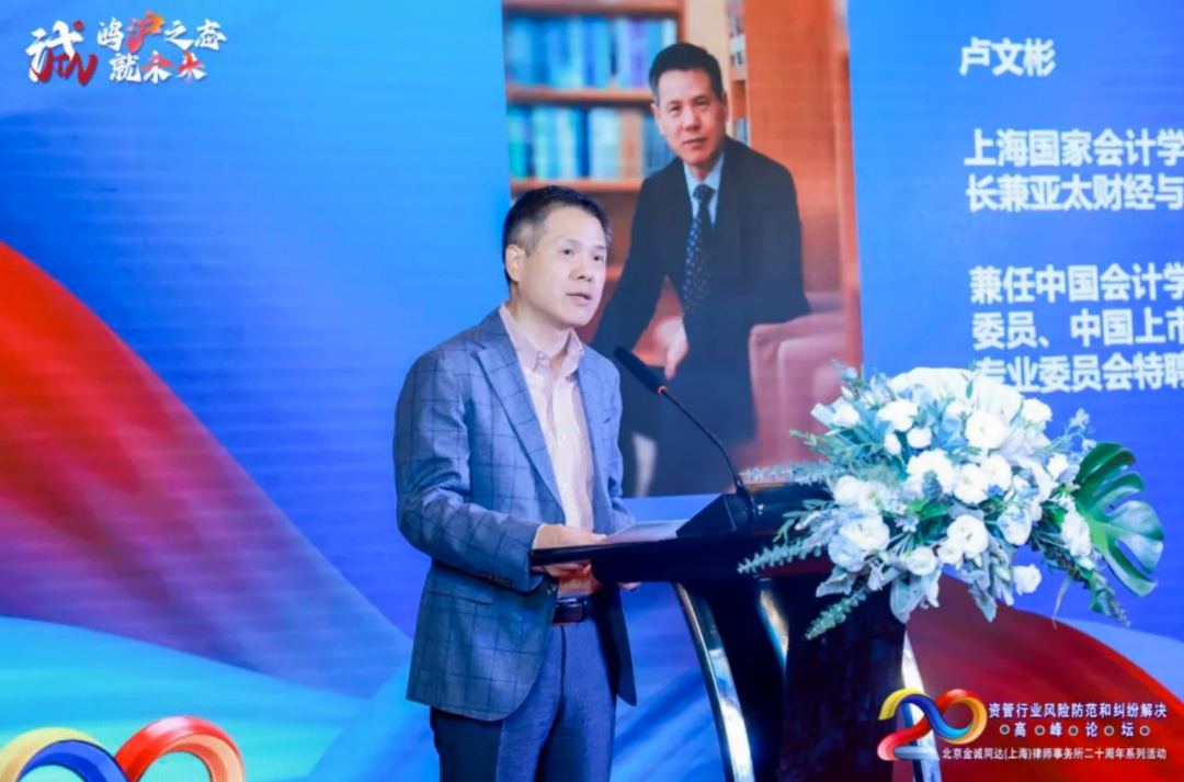上海国家会计学院党委副书记、院长卢文彬教授受邀出席了本次论坛并作开幕致辞。卢院长指出,一方面,我国资产管理业务在近十几年的时间里快速发展,虽然在满足不同主体投融资需求、改善社会融资结构等方面发挥了积极作用,但同时也存在部分业务发展不合规、风险层出不穷、纠纷日趋增多的问题。另一方面,陆家嘴近年来也已经成为了国际知名资产管理机构的重要聚集地,大大推动了上海资管行业的发展。有鉴于此,本次在陆家嘴举办的论坛,无论是在地点还是主题上都具有重要意义。同时,卢院长表示,上海国家会计学院通过陆家嘴学习社这个重要的平台,多年来持续将各届优秀校友汇聚一堂,包括金诚同达上海分所多位合伙人和资深律师也是我院优秀校友,与陆家嘴金融城以及其他不同地区、各行各业的人才精英相互交流,共同学习,不断进步,也希望陆家嘴学习社能够继续活跃,越办越好。致辞最后,卢院长对金诚同达上海分所成立二十周年表示了热烈祝贺与美好祝愿。