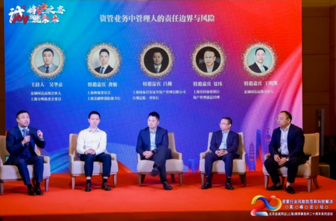 最后,论坛进入圆桌讨论环节。由金诚同达高级合伙人吴华彦律师主持,上海仲裁委员会上海金融仲裁院秘书长龚骏先生,上海国泰君安证券资产管理有限公司合规总监、监督长吕巍先生,上海农村商业银行资产管理部总经理夏玮先生,金诚同达高级合伙人王明凯律师,围绕适当性义务的履行和发生争议时管理人责任的认定两个问题,进行了深入探讨。