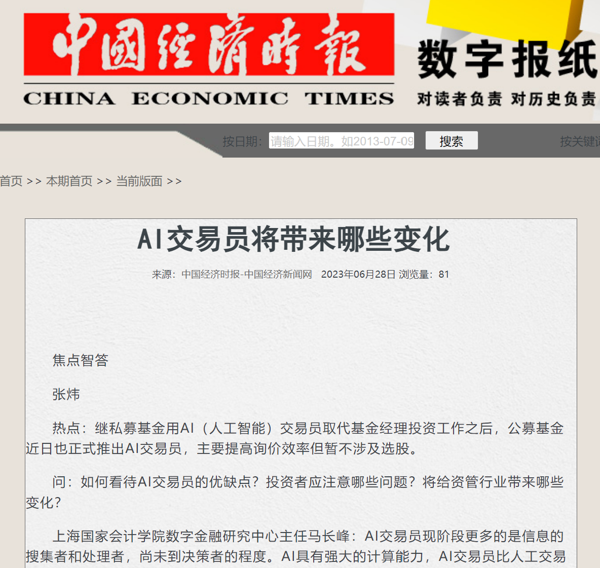 行业观点:马长峰|中国经济时报:AI交易员将带来哪些变化 【2023年6月28日】