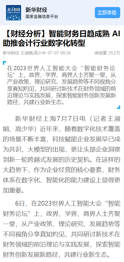 新华财经:【财经分析】智能财务日趋成熟 AI助推会计行业数字化转型【2023年7月7日】