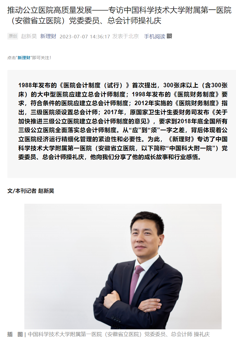 新理财:推动公立医院高质量发展——专访中国科学技术大学附属第一医院(安徽省立医院)党委委员、总会计师操礼庆【2023年7月7日】】 原创 赵新昊 新理财 2023-07-07 14:36:17