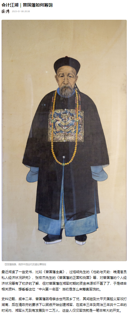 行业观点:袁敏|澎湃新闻:会计江湖|曾国藩如何筹饷【2023年7月8日】