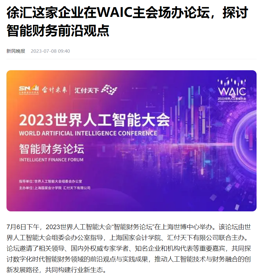 《新民晚报》:徐汇这家企业在WAIC主会场办论坛,探讨智能财务前沿观点【2023年7月8日】