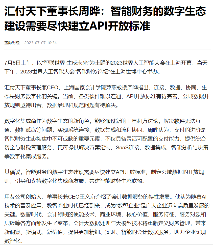 蓝鲸财经:汇付天下董事长周晔:智能财务的数字生态建设需要尽快建立API开放标准【2023年7月7日】