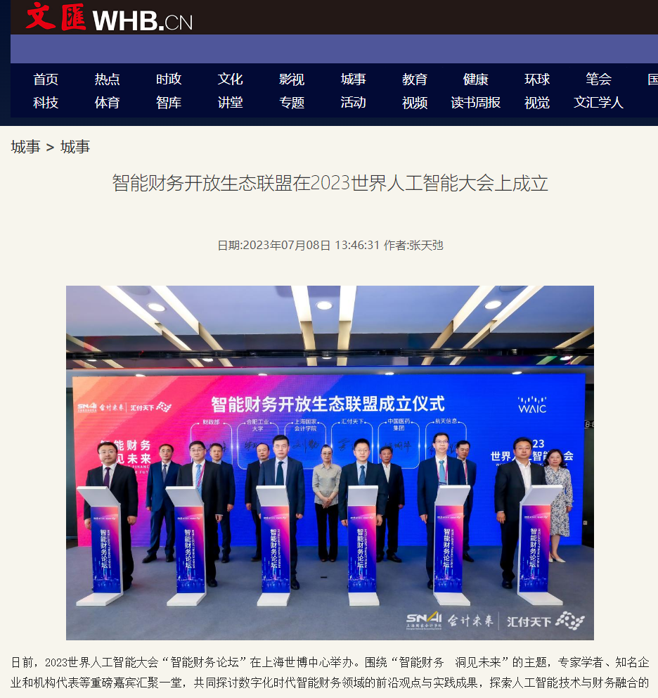 《文汇报》:智能财务开放生态联盟在2023世界人工智能大会上成立【2023年7月8日】