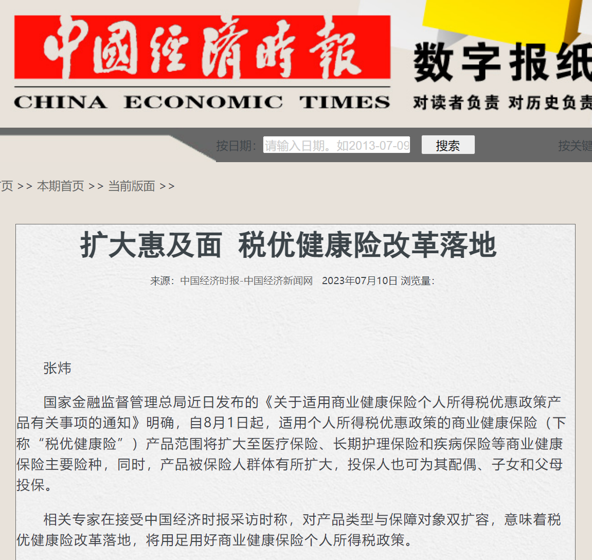 行业观点:方国斌|中国经济时报:扩大惠及面 税优健康险改革落地【2023年7月10日】