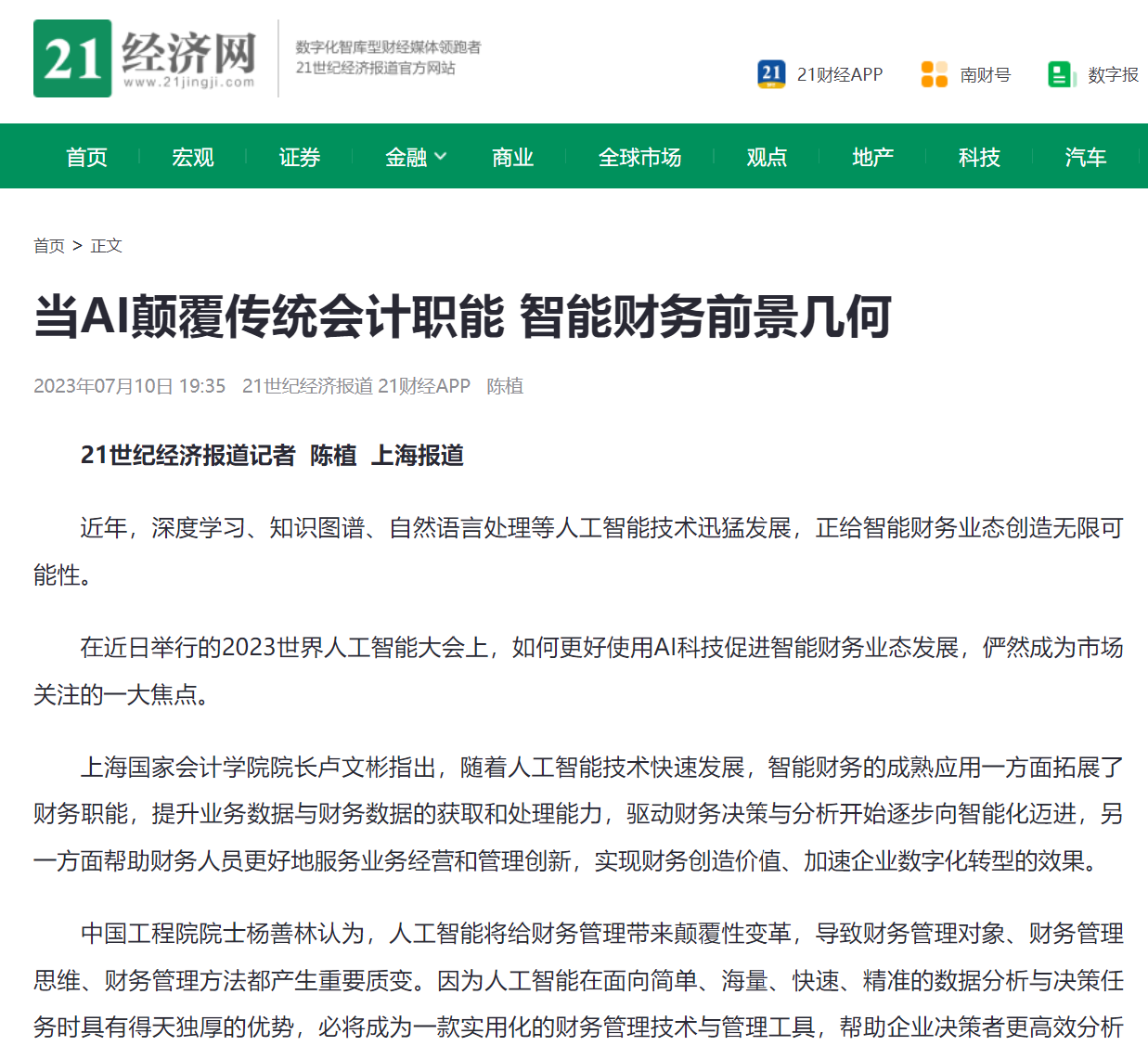 21世纪经济报道:当AI颠覆传统会计职能 智能财务前景几何【2023年7月10日】