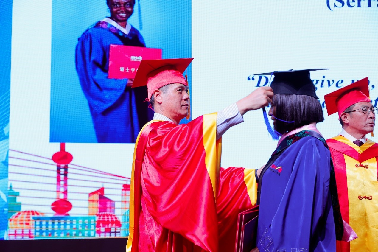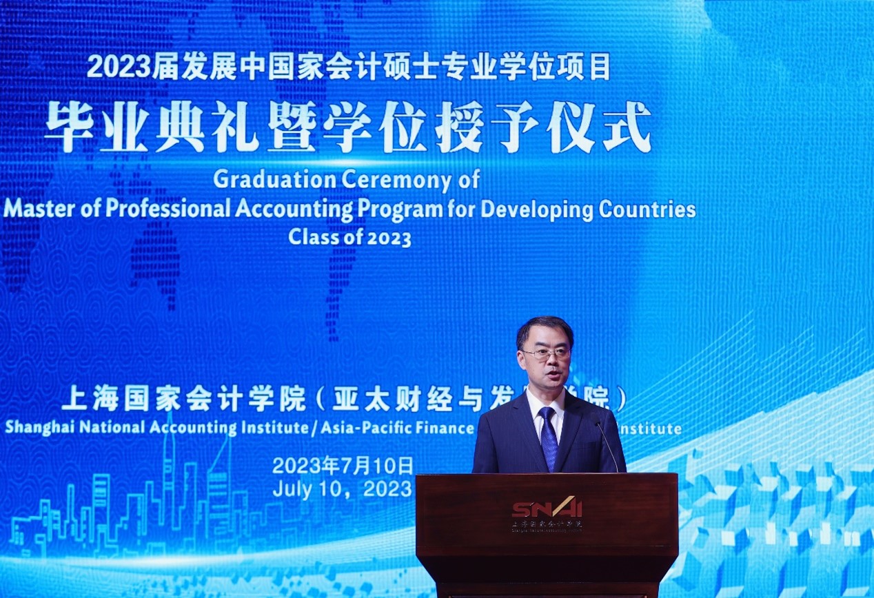7月10日下午,上海国家会计学院2023届发展中国家会计硕士专业学位项目毕业典礼暨学位授予仪式在学院国际会议中心举行。联合国工业发展组织前总干事李勇先生、商务部国际商务官员研修学院雷浩副院长、财政部会计司(国家会计学院董事会办公室)高大平副司长等特邀嘉宾,以及学院全体领导班子、学院相关部门负责人及教师代表共同出席典礼。来自纳米比亚、津巴布韦、埃塞俄比亚、博茨瓦纳、塞拉利昂、卢旺达、柬埔寨和老挝等8个国家的20名2023届毕业留学生及其亲友,以及在院2024届留学生参加典礼。
