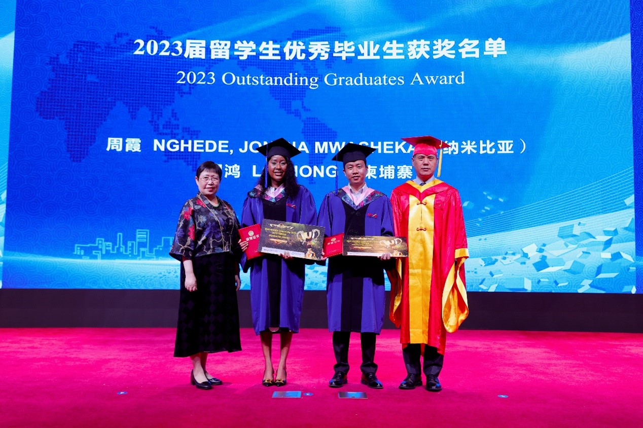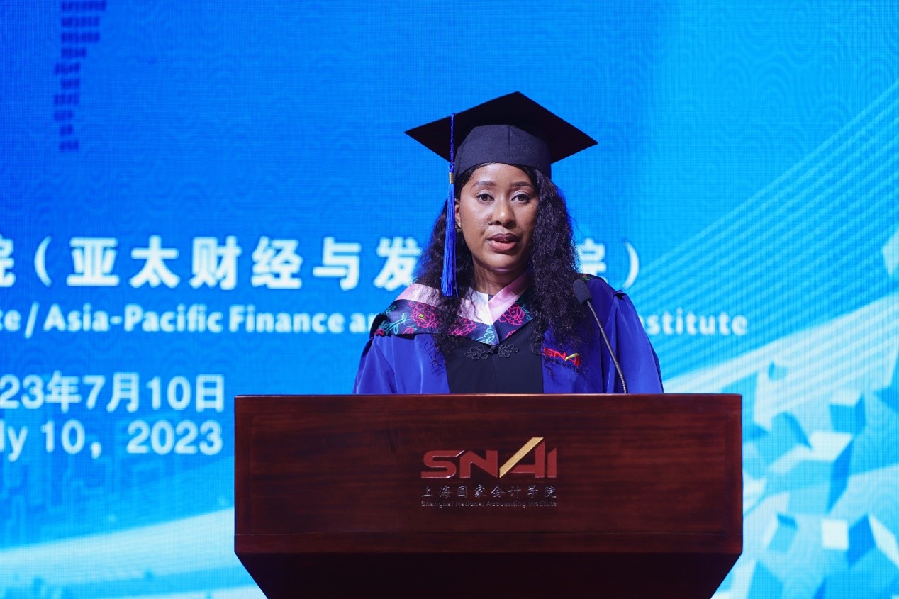 来自纳米比亚财政部的周霞(NGHEDE, JONISIA MWASHEKA)、柬埔寨中央银行的罗鸿(LO, HONG)代表毕业生、王蕾副教授代表学院教师分别进行了精彩的发言。现场还播放了2023届留学生毕业视频短片《一路繁花一路景,且以前行付初心》,回顾总结2023届留学生过去两年学习的精彩瞬间,其积极向上的精神风貌给现场所有人留下深刻印象。