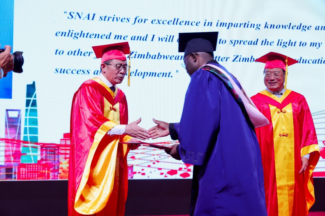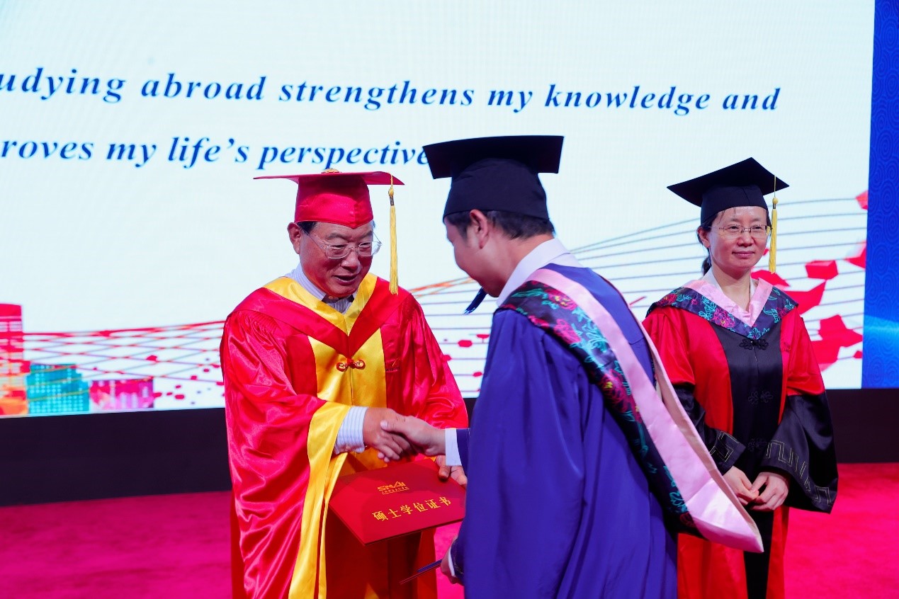 卢文彬院长发表了毕业典礼致辞,对毕业留学生表示祝贺,并对同学们两年来付出的巨大努力以及在学习专业知识技能、了解中国国情文化和促进跨文化交流方面取得的成绩表示充分肯定。他寄语留学生,希望大家一是保持终身学习、勤于思考的习惯。通过持续学习,不断取得新的进步,才能应对未来的各种挑战。二是不忘初心,勇于担当。充分利用在中国的所学所思所感所悟,结合本国实际,推动本国发展,同时在面对急难险重的事情和复杂局面时,不当看客、敢做先锋。三是做中外友谊和合作交流的使者。继续发扬真诚合作,互帮互助的精神,携手发展共创繁荣,为深化所在国家和中国的友谊和合作以及促进民心相通,推动构建人类命运共同体贡献力量。