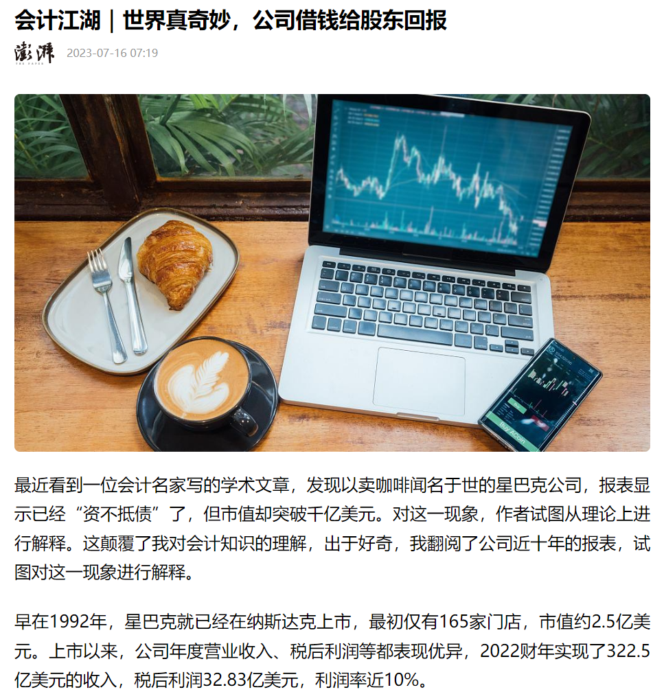 最近看到一位会计名家写的学术文章,发现以卖咖啡闻名于世的星巴克公司,报表显示已经“资不抵债”了,但市值却突破千亿美元。对这一现象,作者试图从理论上进行解释。这颠覆了我对会计知识的理解,出于好奇,我翻阅了公司近十年的报表,试图对这一现象进行解释。