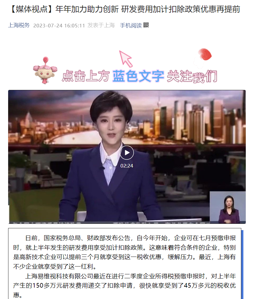上海易维视科技有限公司最近在进行二季度企业所得税预缴申报时,对上半年产生的150多万元研发费用递交了扣除申请,很快就享受到了45万多元的税收优惠。