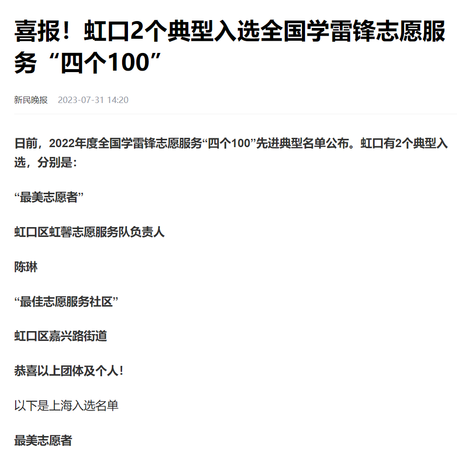 《新民晚报》:喜报!虹口2个典型入选全国学雷锋志愿服务“四个100”【2023年7月31日】