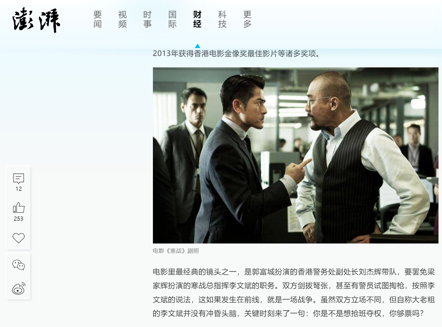 2012年,由郭富城、梁家辉等主演的一部动作电影《寒战》引起广泛关注,并在2013年获得香港电影金像奖最佳影片等诸多奖项。