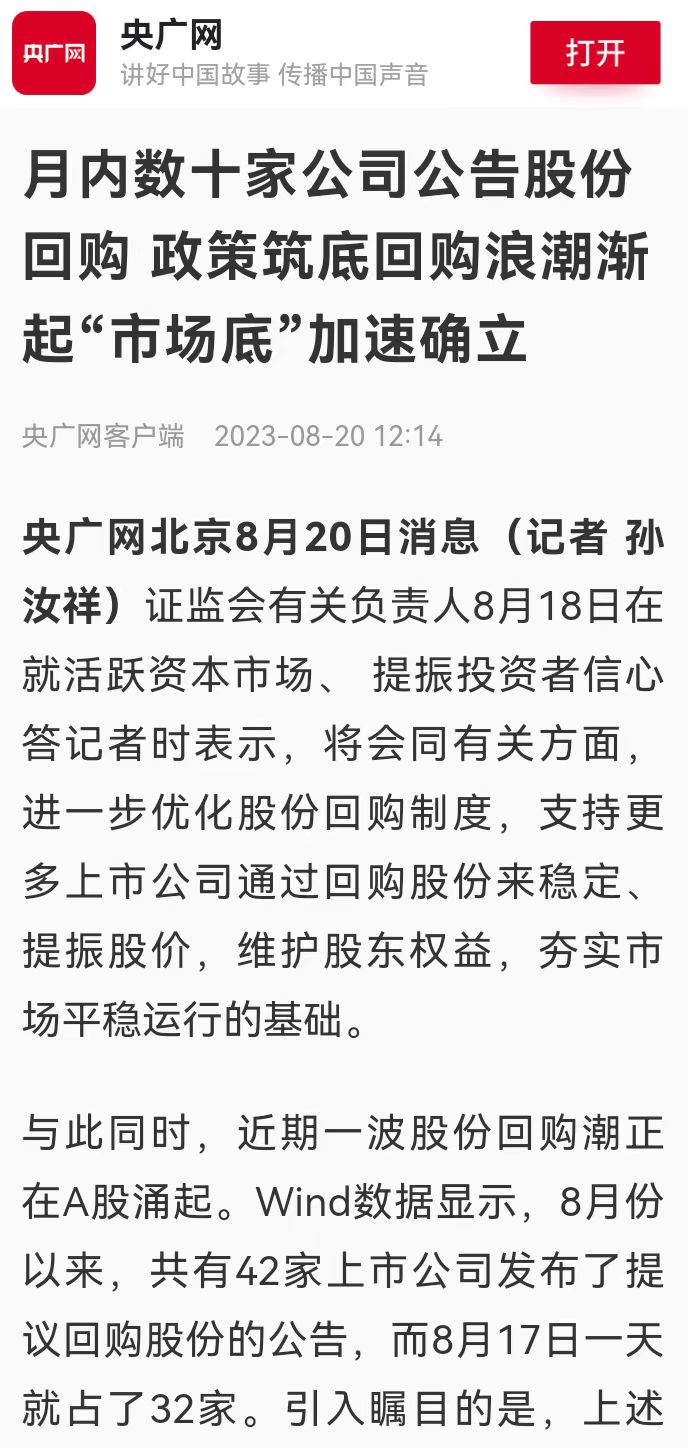 行业观点:叶小杰|央广网:月内数十家公司公告股份回购 政策筑底回购浪潮渐起“市场底”加速确立【2023年8月20日】