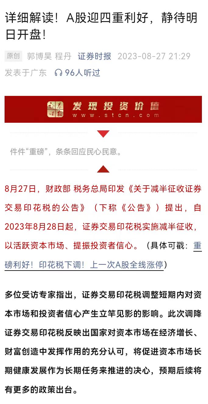 8月27日,财政部 税务总局印发《关于减半征收证券交易印花税的公告》(下称《公告》)提出,自2023年8月28日起,证券交易印花税实施减半征收,以活跃资本市场、提振投资者信心。(具体可戳:重磅利好!印花税下调!上一次A股全线涨停)