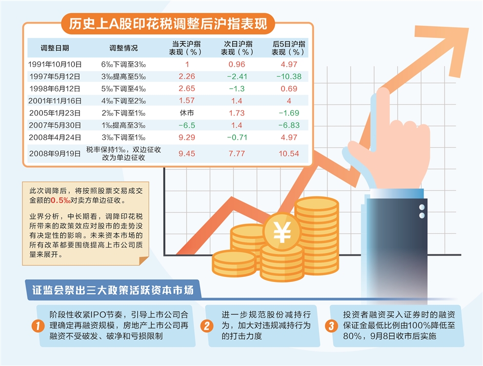 从市场影响看,历次证券交易印花税税率下调均对资本市场形成很好的提振效果。比如,2008年4月24日,证券交易印花税率由3‰下调为1‰,提振上证综指大涨9.29%。又如,2008年9月19日,证券交易印花税由双边征收改为单边征收,提振上证综指大涨9.45%。