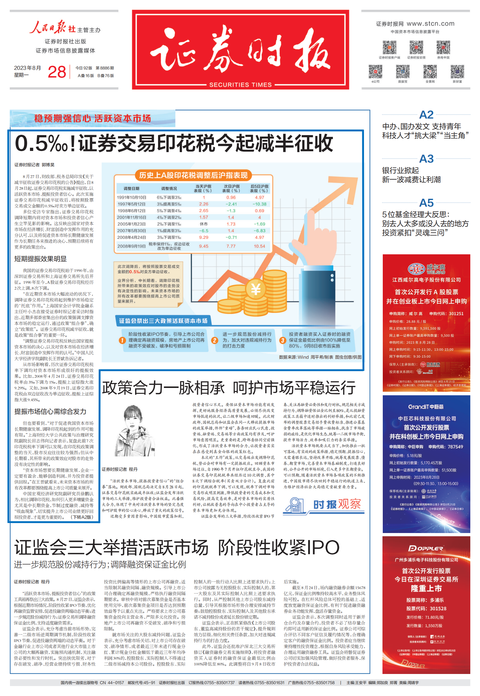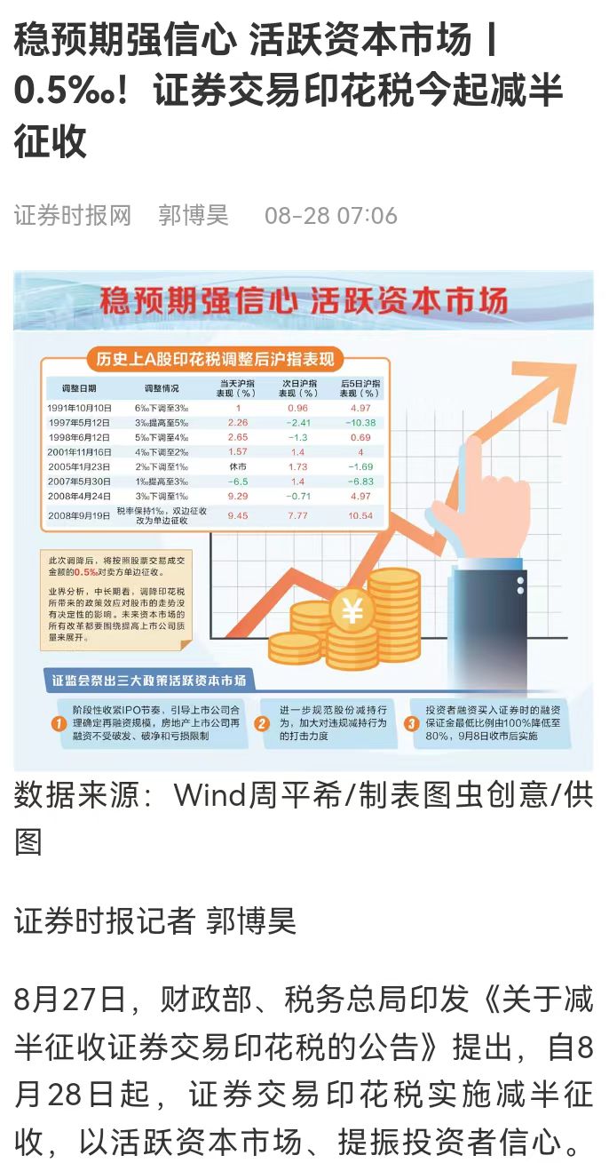 行业观点:叶小杰|《证券时报》:稳预期强信心 活跃资本市场丨0.5‰!证券交易印花税今起减半征收【2023年8月28日】