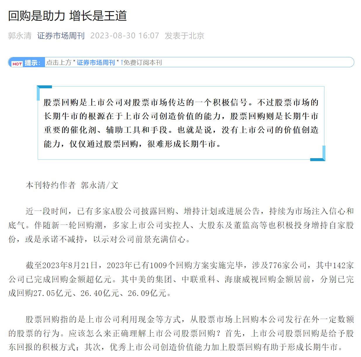 行业观点:郭永清|证券市场周刊: 回购是助力 增长是王道【2023年8月30日】