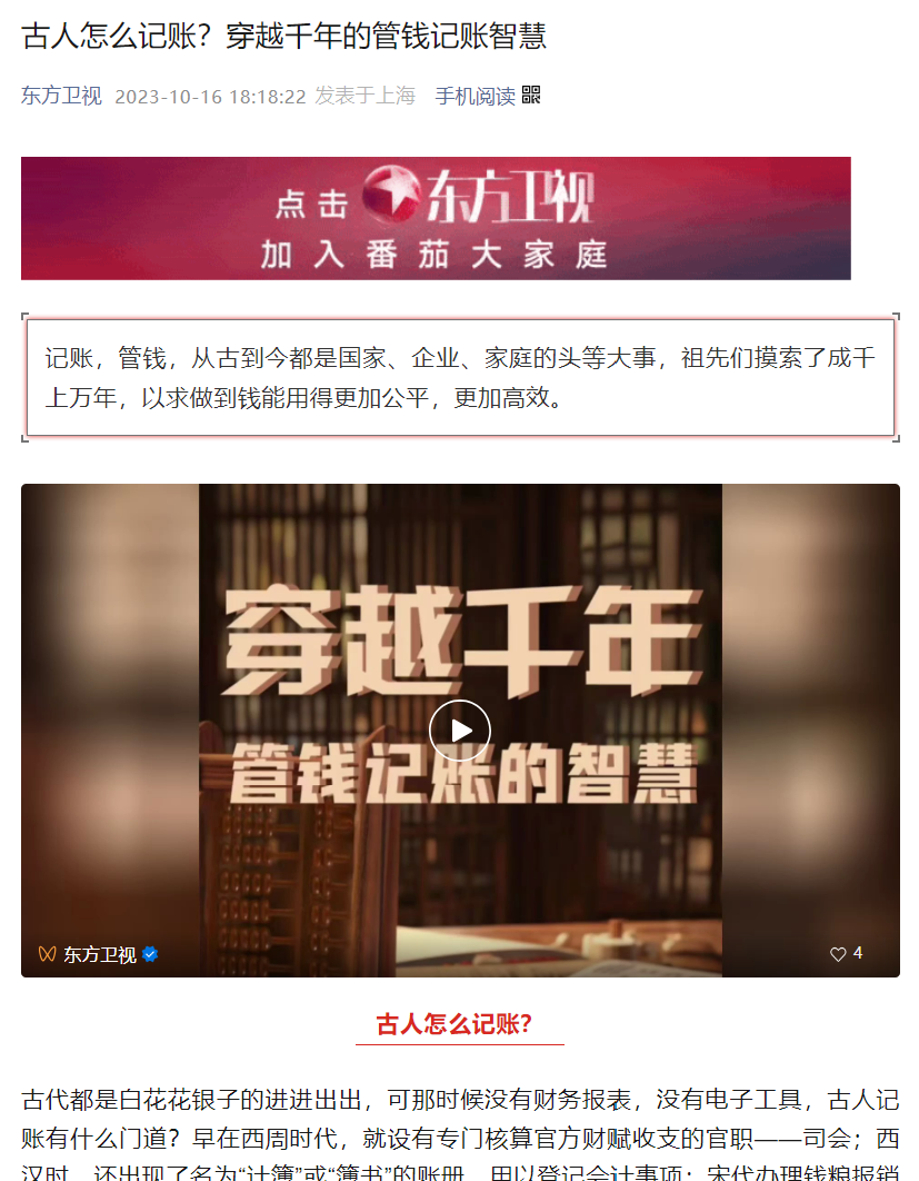 行业观点:叶小杰|东方卫视:古人怎么记账?穿越千年的管钱记账智慧【2023年10月16日】