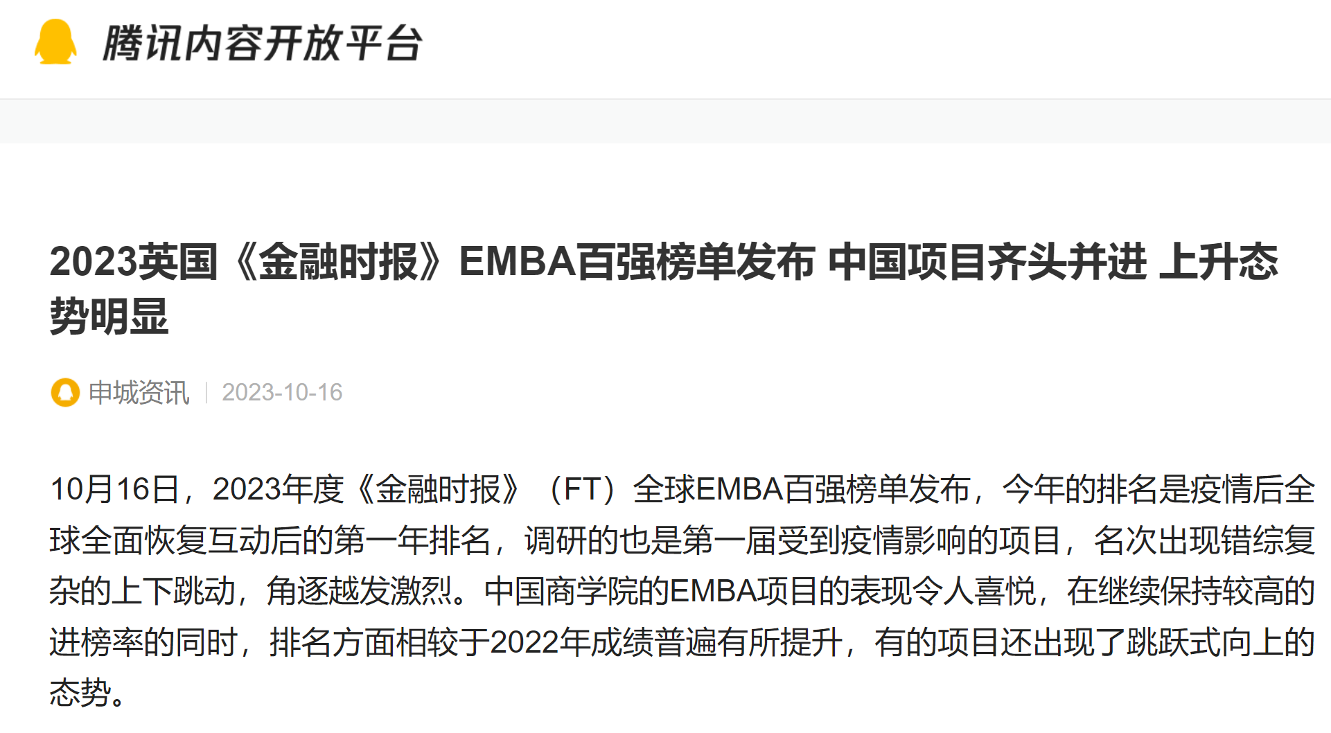 腾讯网:2023英国《金融时报》EMBA百强榜单发布 中国项目齐头并进 上升态势明显【2023年10月16日】
